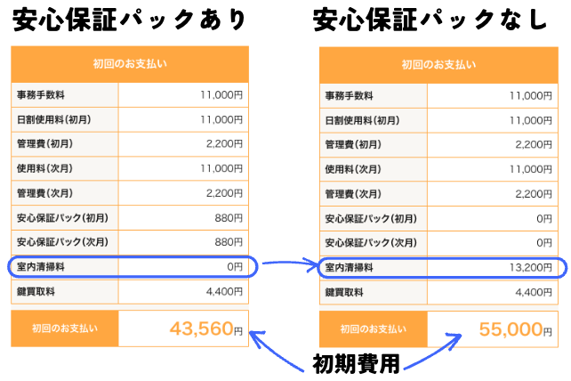 なので、安心保証パックを付けず、室内整備料(13,200円)を先に払うのもありです。