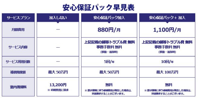どちらの場合も、安心保証パックは「高い方のプラン 月額 1,100円」で計算しています。「安い方のプラン 月額 8800円」を選べばさらに初期費用を抑えられますよ。